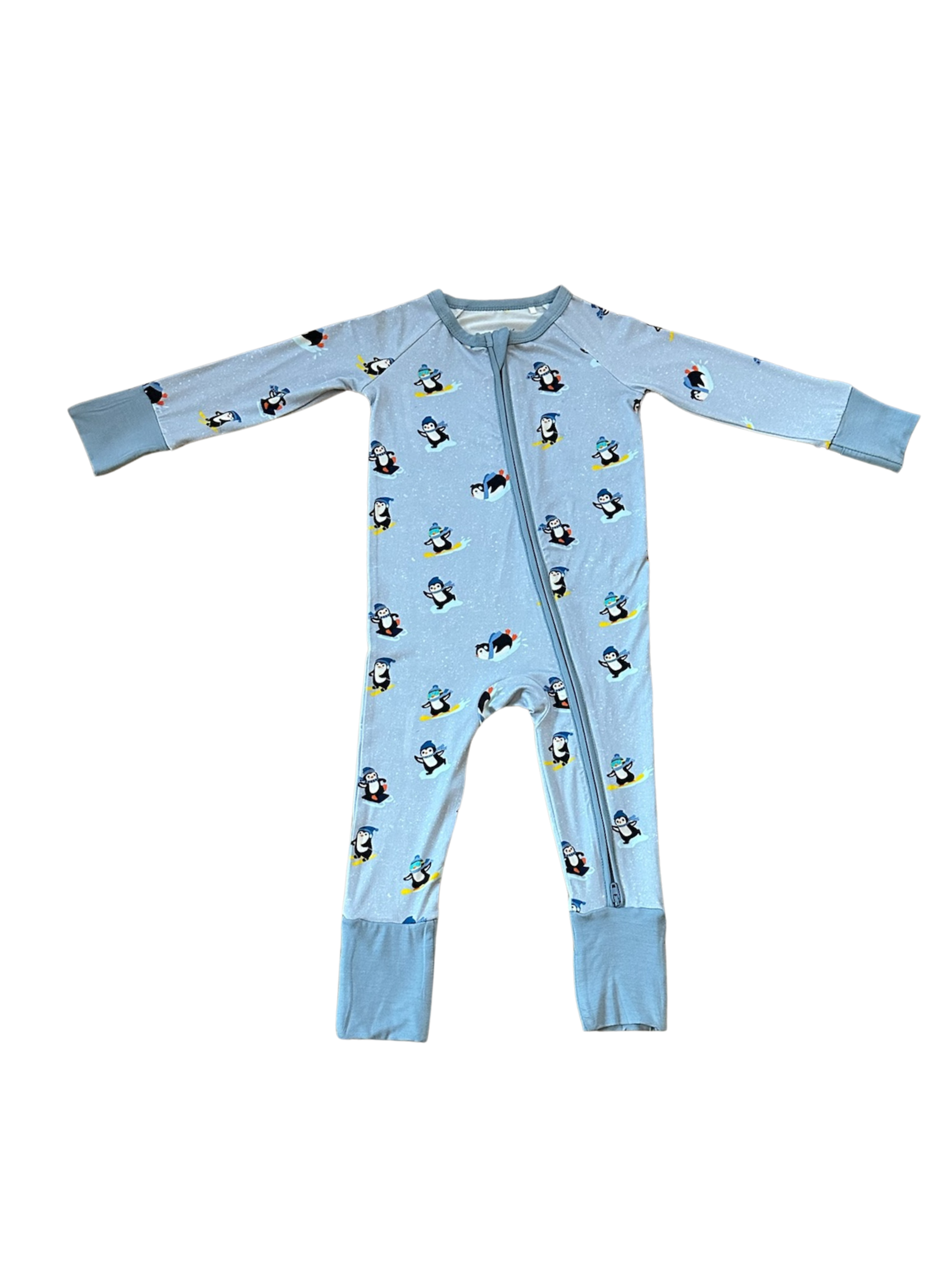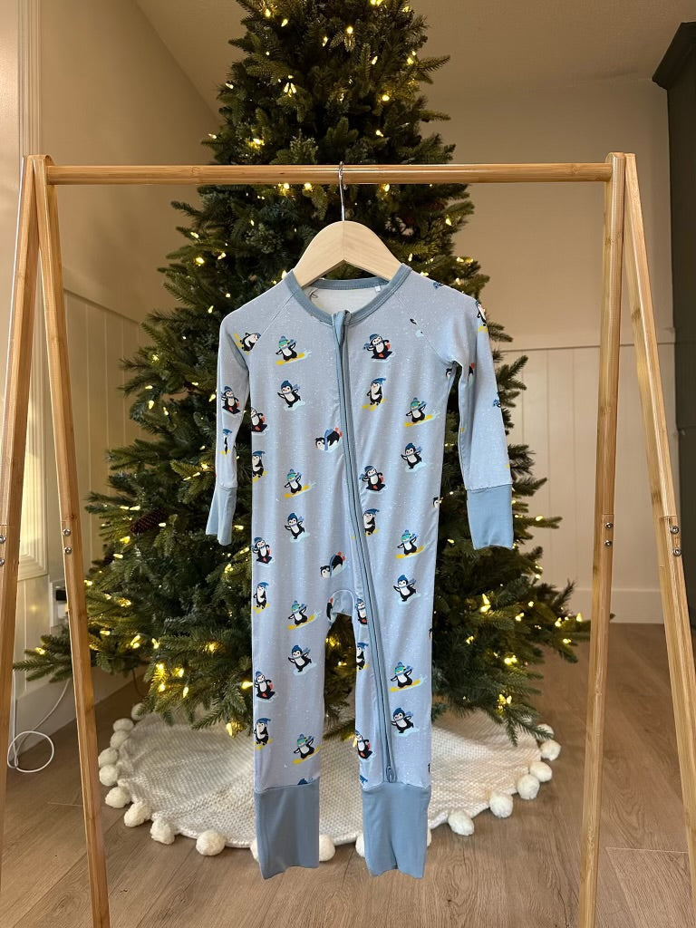 Bring winter fun to every snuggle with our Powder Penguins sleeper. Featuring playful penguins hitting the slopes in cozy snow scenes, this adorable design adds festive cheer and whimsy to your little one’s holiday wardrobe.